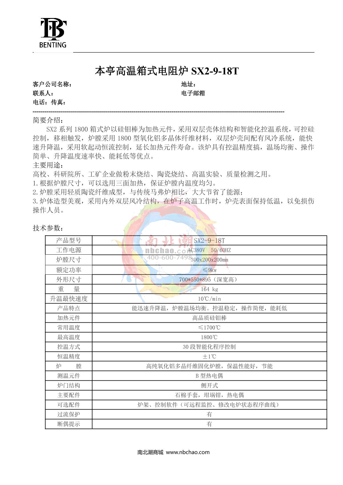 BenTing SX2-9-18T High temperature box Resistance Furnace brochure