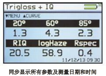 Rhopoint IQ can measure 20/60/85° gloss (GLOSS), peak reflectance (RSPEC), reflection haze (HAZE), imaging quality (RIQ), vividness (DOI), and reflection curve distribution.