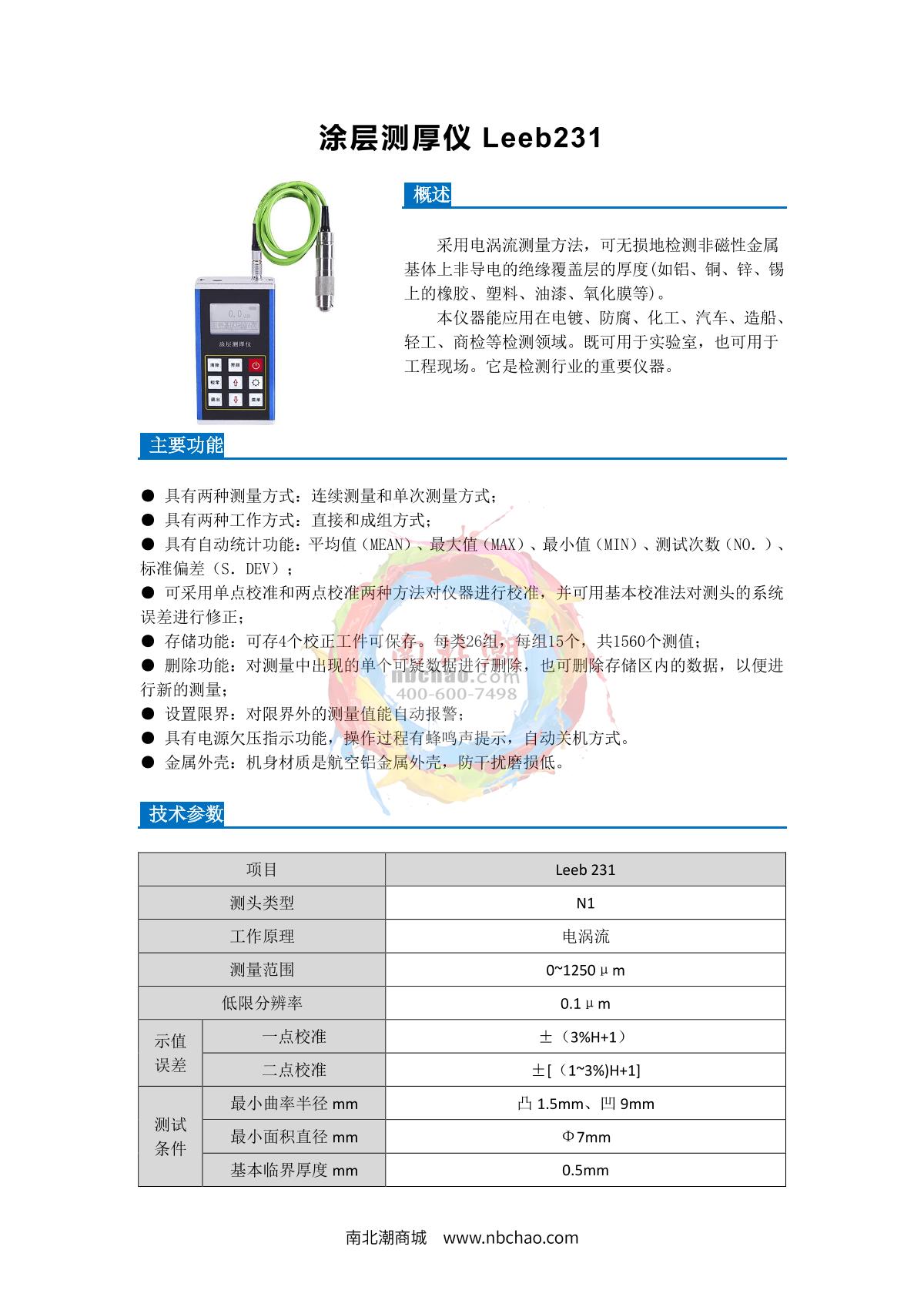 Leeb222 (N1) eddy current Thickness Gauge for non-magnetic metal substrateseddy current0 ~ 1250µm±3%SE -