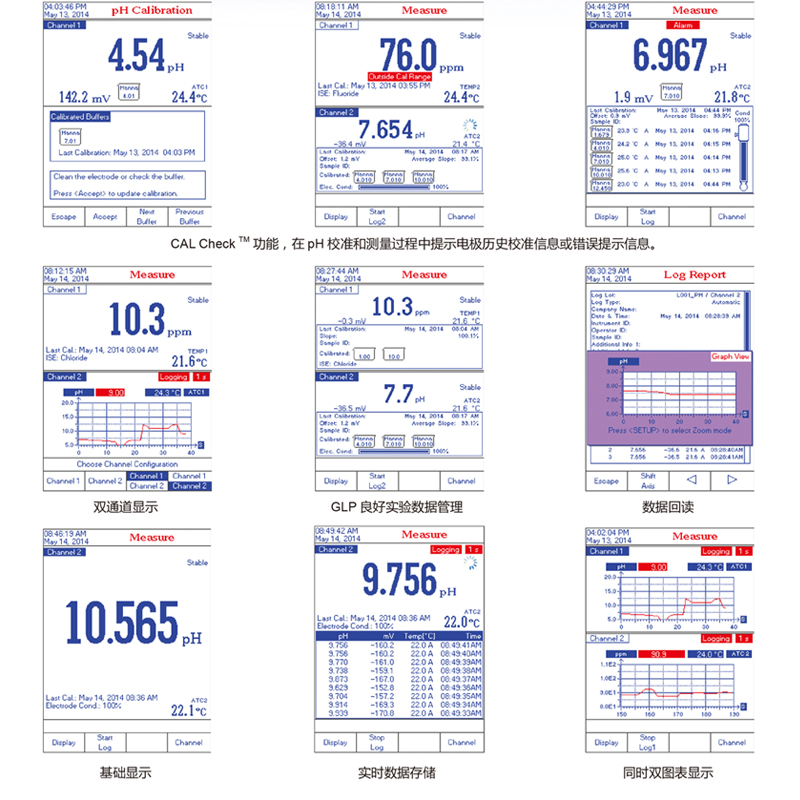 5-point pH automatic recognition calibration, with 8 built-in standard points and 5 custom calibrations;