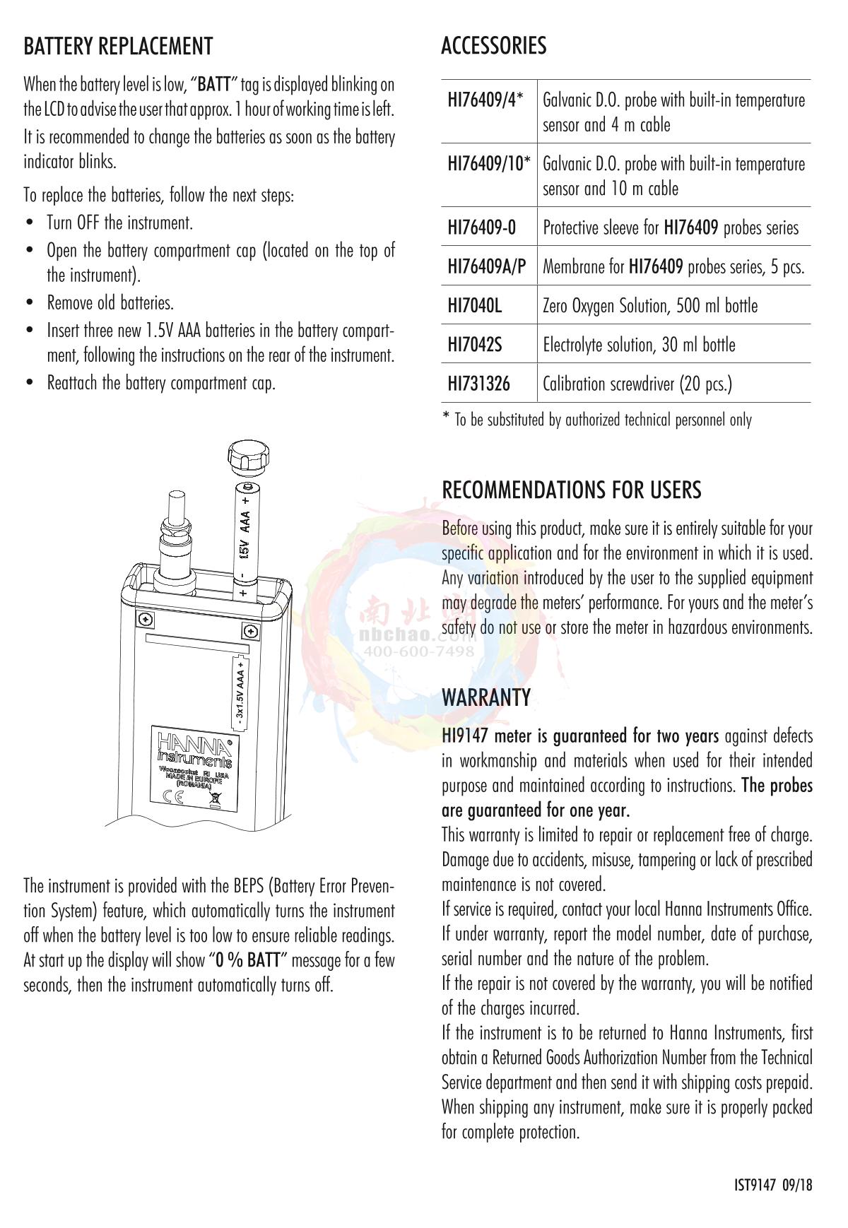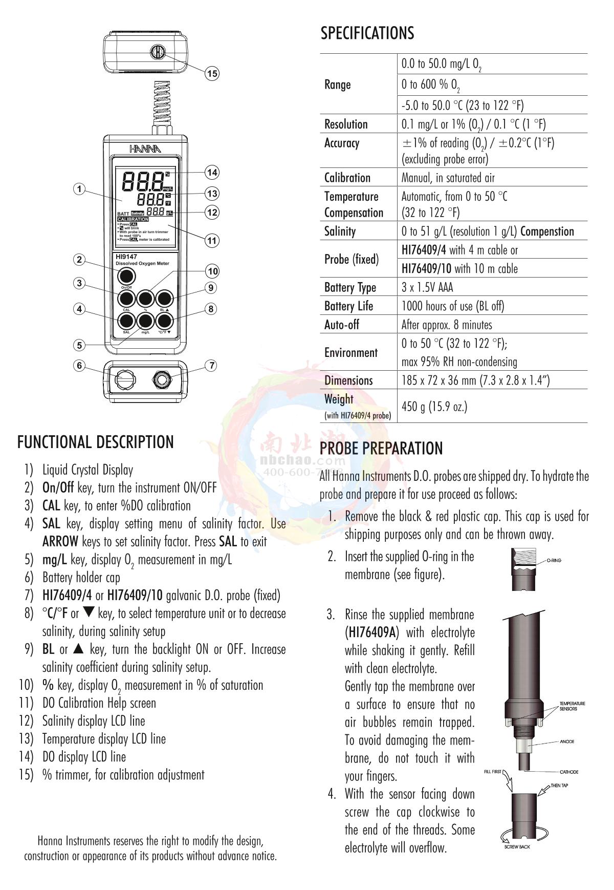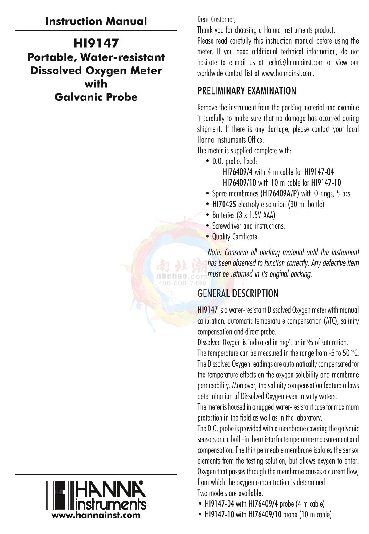 HANNA HI9147-04 Dissolved Oxygen Meter Manual,OI