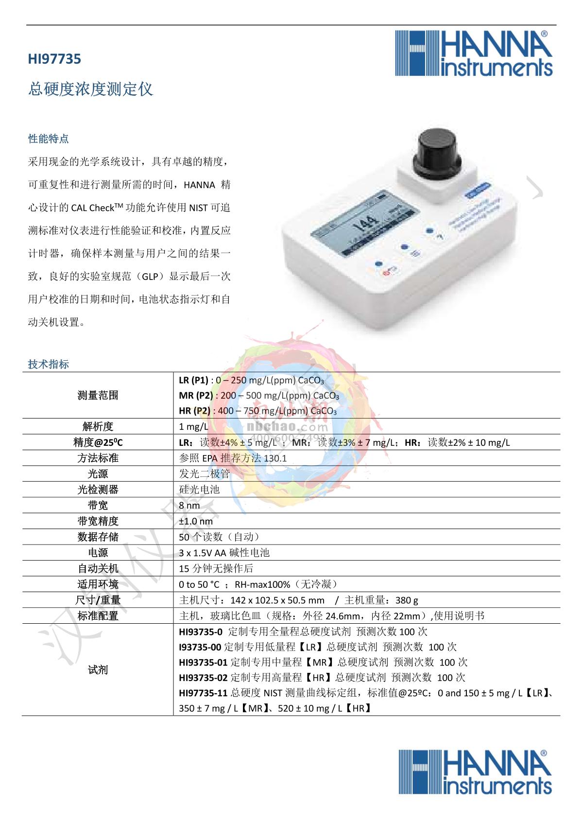 HANNA HI97735 Total hardness concentration Tester, photometerLR(P1):O-250mg/L(ppm)CaCO₃;MR(P2):200-500 mg/L(ppm)CaCO;HR(P2):400-750mg/L(ppm)CaCO₃1 mg/LLR: reading +/- 4% +/- 5mg/L; MR: reading +/- 3% +/- 7mg/L; HR: reading +/- 2% +/- 10mg/L¥3020.0SE -