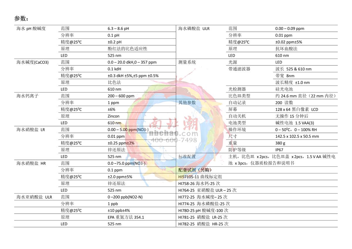 HANNA HI715 Ammonia Nitrogen MR Tintometer0.00 to 9.99 ppmNH3-N0.01 ppm+/- 0.05 ppm +/- 5% of the reading¥790.0SE -