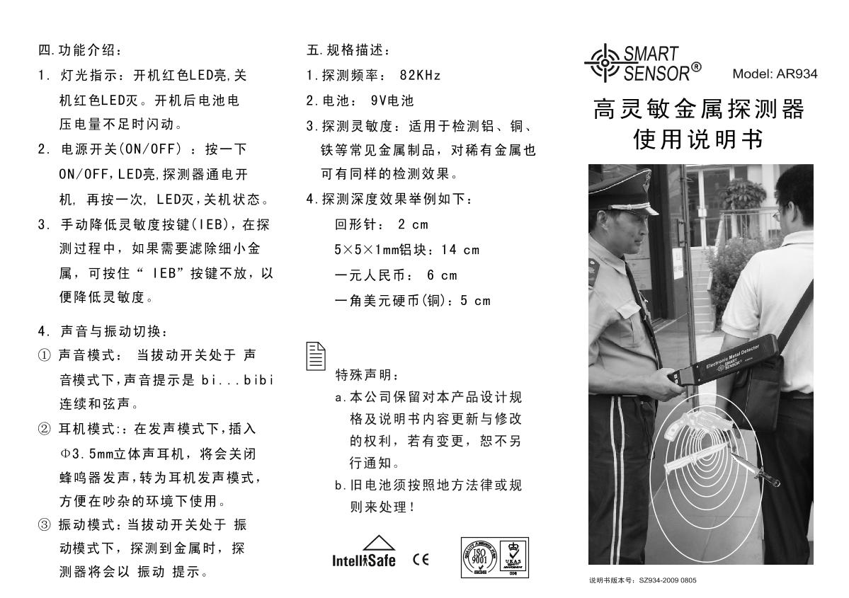 SMART SENSOR AR934 Handheld metal Detector Manual,OI