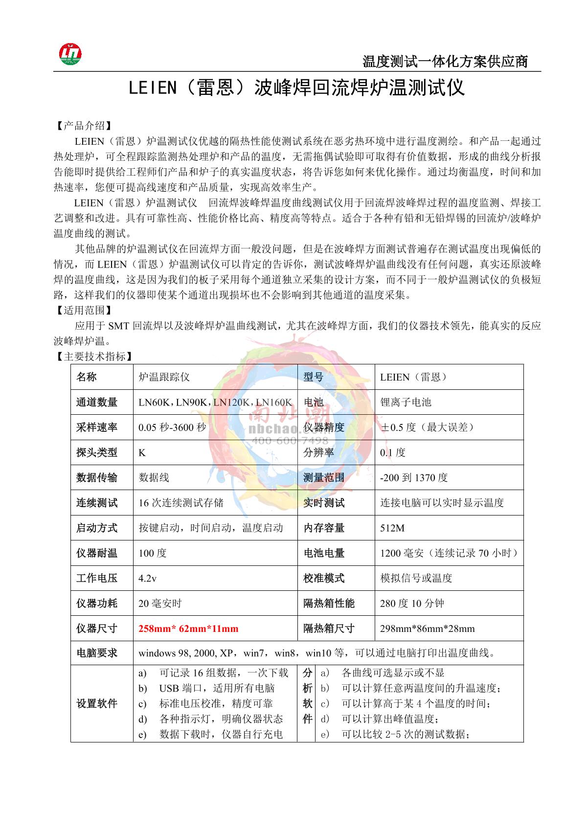 Rennes LN-60K Semiconductor curing Furnace temperature tracker 6 channels 200 ℃ 1 hour6 channel200 ℃ for 60 minutes, 150 ℃ for 90 minutes, 100 ℃ for 120 minutes-50-200 ℃; 1-30 hours (customized according to the actual situation of the user)¥13800.0SE -