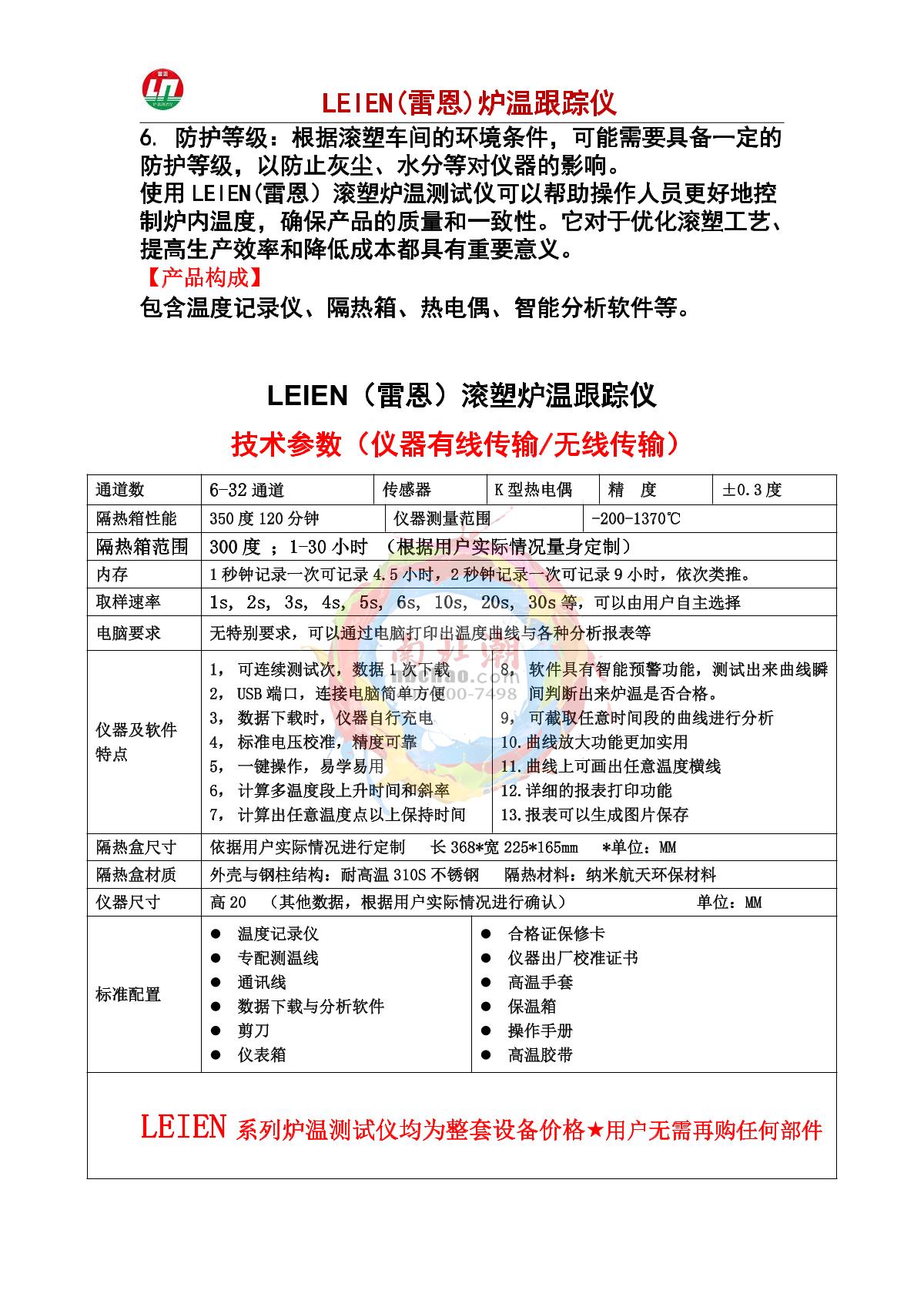 Rennes LN-60K Furnace temperature tracker 6 channels 500 ℃ 1 hour6 channel500 ℃ for 60 minutes, 400 ℃ for 90 minutes, 300 ℃ for 120 minutes500 ℃; 1-30 hours (customized according to the actual situation of the user)¥10500.0SE -