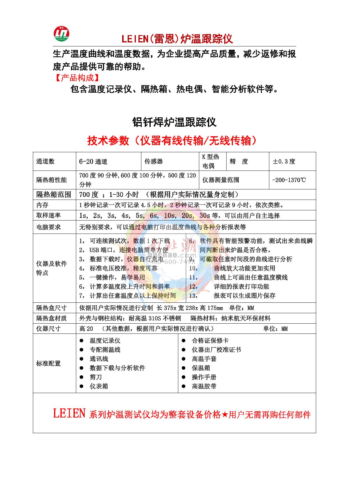 Rennes LN-60K aluminum brazing special Furnace temperature tracker 6 channels 700 ℃ 1 hour6 channel700 ℃ for 90 minutes, 600 ℃ for 100 minutes, 500 ℃ for 120 minutes700 ℃; 1-30 hours (customized according to the actual situation of the user)¥26000.0SE -