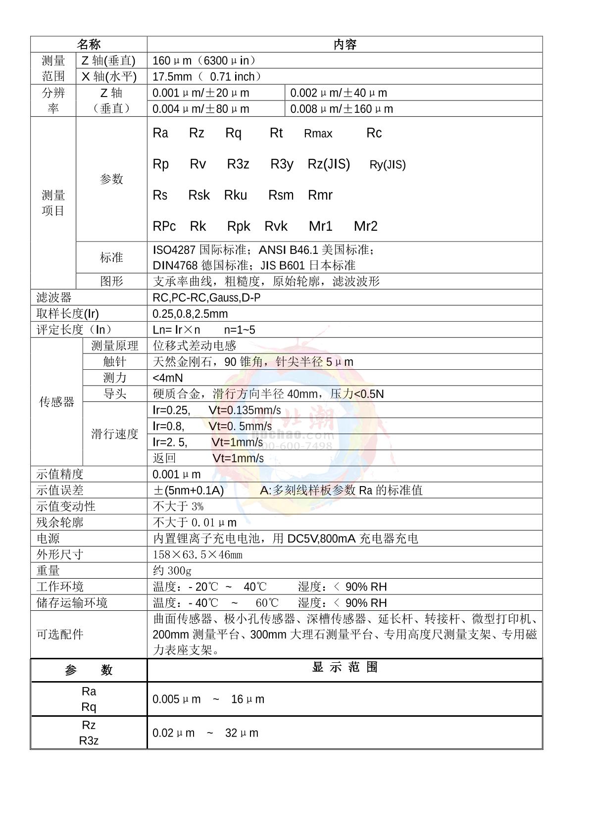 KAIRDA NDT151 Roughness Gauge asperity Measurement InstrumentRa、Rz、Rq、Rt、Rmax、Rc、Rp、Rv、R3z、R3y、Rz(JIS)、Ry(JIS)Rs、Rsk、Rku、Rsm、Rmr、RPc、Rk、Rpk、Rvk、Mr1、Mr2Z-axis (vertical) 160μm (6300μin); X-axis (horizontal) 17.5mm (0.71inch)Z-axis (vertical) 0.001 μm/+/- 20 μm 0.002 μm/+/- 40 μm; 0.004 μm/+/- 80 μm 0.008 μm/+/- 160 μm¥4000.0SE -