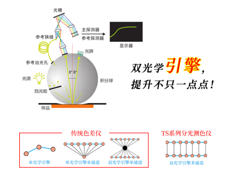 Taishuang TS7X series grating Spectrophotometer is a grating Spectrophotometer that 3nh spent 3 years and carefully designed, with independent intellectual property rights. The instrument uses 1000-line precision shining grating as the beamsplitting element, built-in silicon photodiode array (double row 40 groups) sensor, imported whiteboard, repeatability ΔE*ab is easily controlled within 0.03, using high-life full-spectrum LED as the light source, and the optical resolution is less than 10nm in the visible light range.