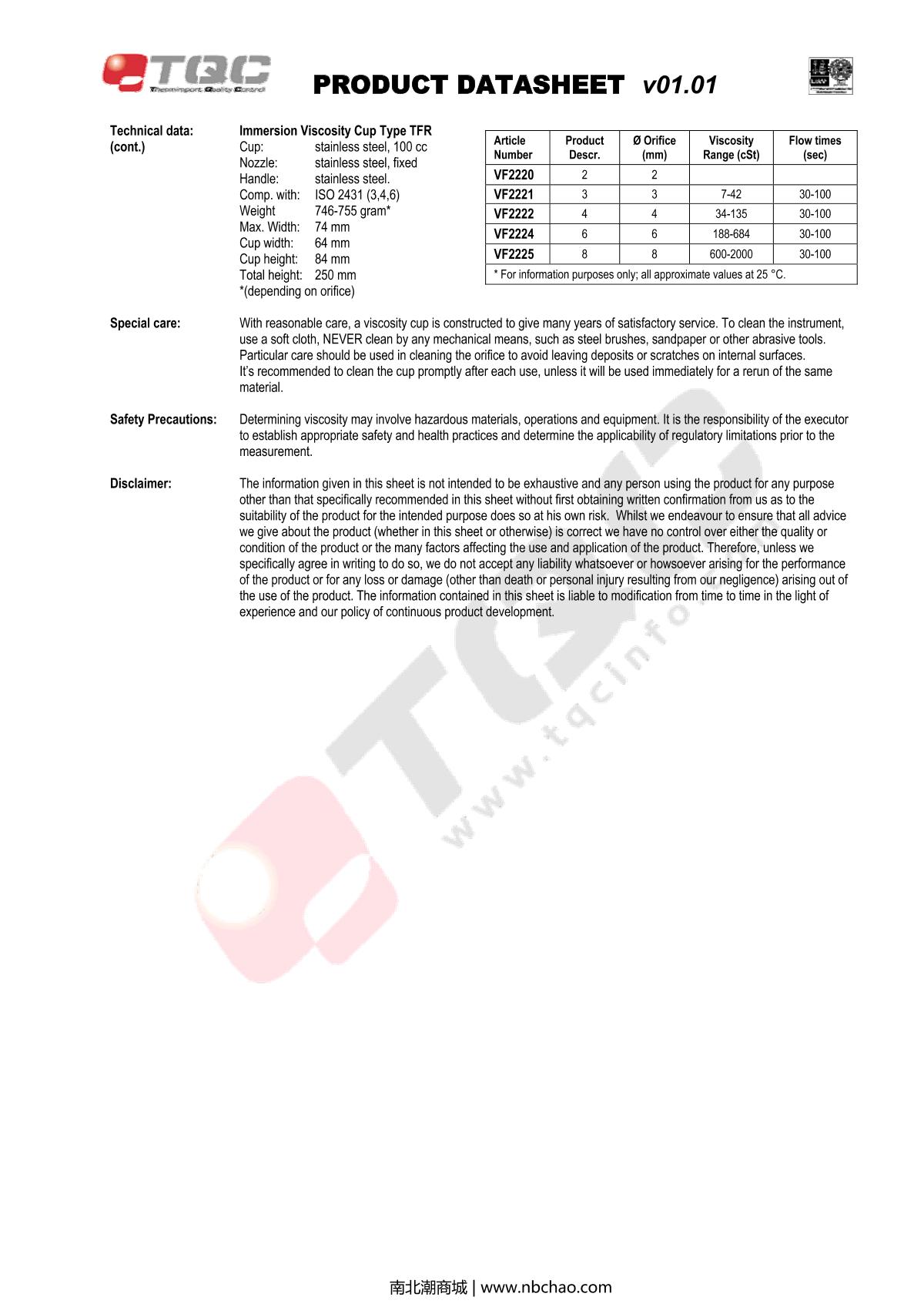 TQC sheen VF2185 Immersion Viscosity Cup Manual,OI