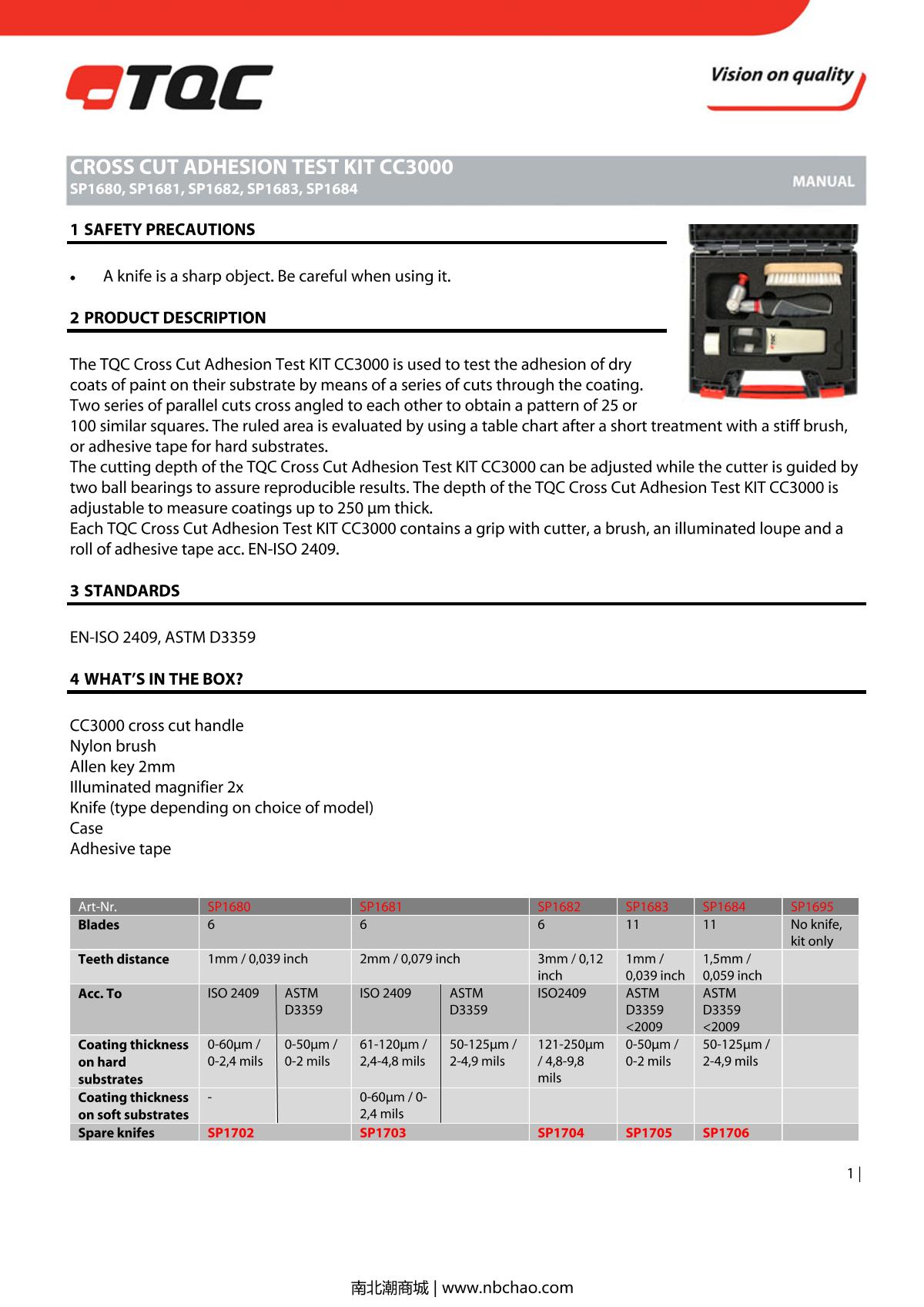 TQC sheen SP1683 Adjustable cross-cut adhesion Tester Manual,OI