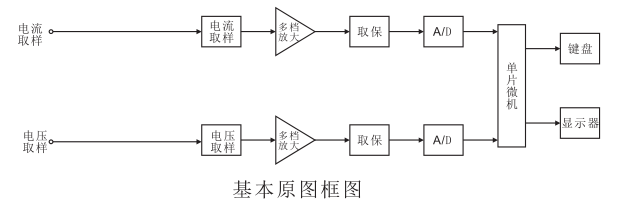 After the measured Voltage signal passes through the Voltage sensor, the signal is reduced to a weak signal, and the signal is largeSmall, controlled by a microcomputer, programmable multi-range amplification, and by a sample-holder, byThe analog/digital converter A/D converts the Voltage signal into a digital signal and transmits the digital signal to the miniatureThe computer calculates the true RMS Voltage (URMS) and outputs the value to the display on the display.After the measured current signal passes through the current sensor, the signal is converted into a weak Voltage signal, which is the same as the measured signalThe Voltage is the same, after multi-gear selection of program-controlled amplification, sampling and holding, A/D conversion, in the microcomputercalculates the True RMS Voltage (IRMS) and outputs the value to the display.