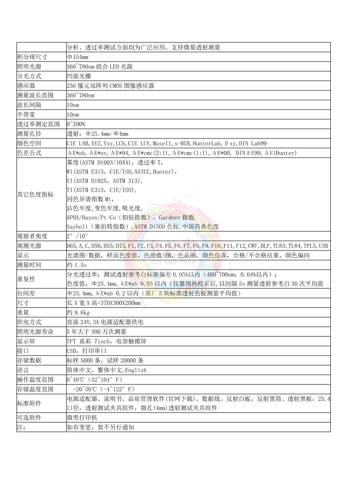 3NH YS6020 desktop Colorimeter xenon arc versionReflection: D/8 (diffuse illumination, 8 ° direction reception); SCI/SCE measurement; including UV/exclude UV measurement; transmission: D/0 (diffuse illumination, 0 ° direction reception) SCI/SCE measurement; including UV/exclude UV measurement; haze (ASTM D1003);F154mm360~780Nm xenon lamp, 400nm cut-off xenon lampSE -