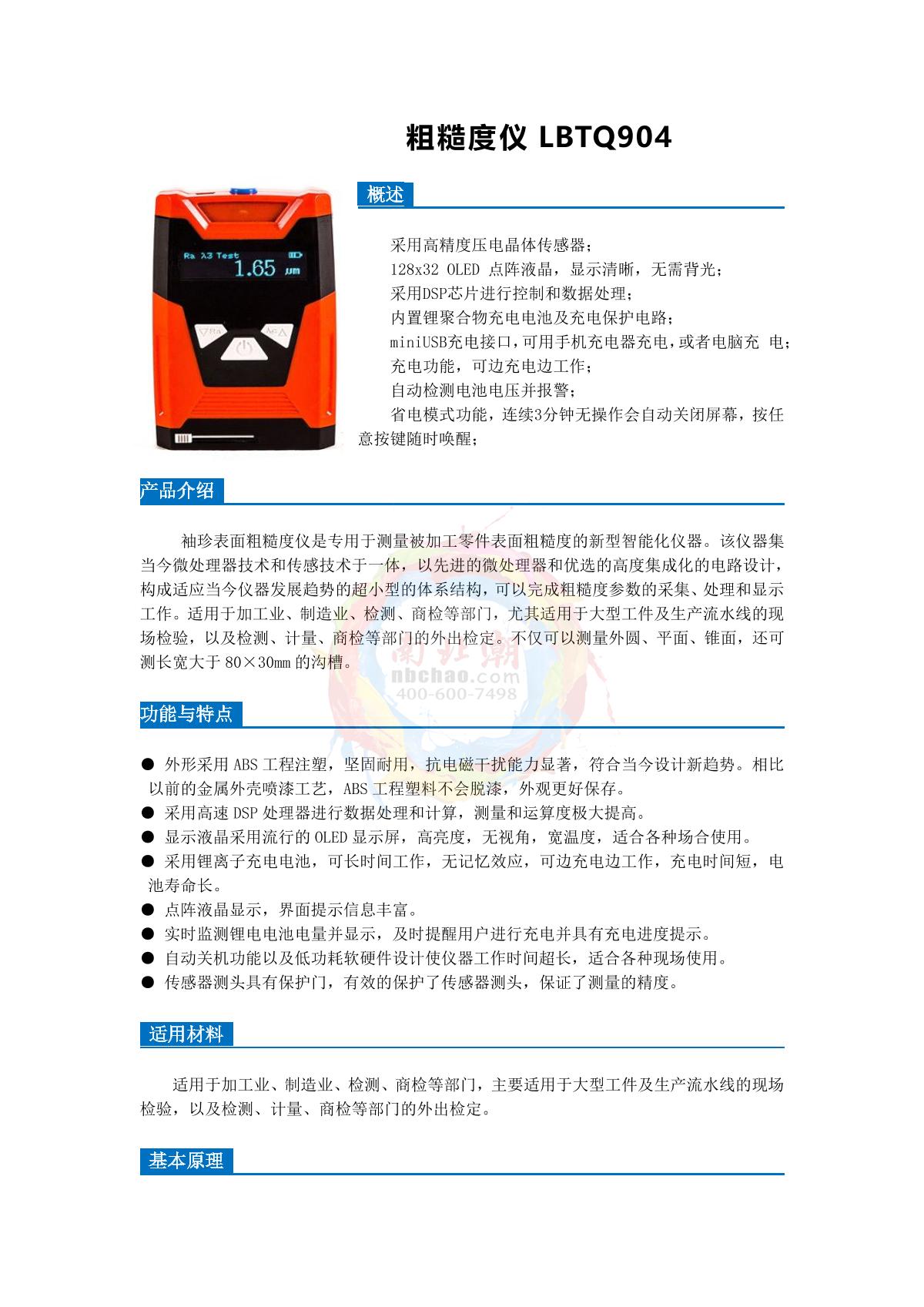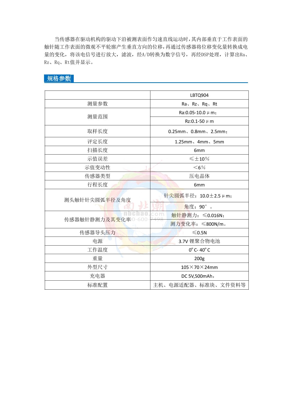 LEEB LBTQ914 surface roughness probe asperity Detector, multiparameterZ-axis (vertical) 160μm X-axis (horizontal) 17.5mmZ-axis (vertical) 0.01μm/+/- 20μm 0.02μm/+/- 40μm 0.04μm/+/- 80μmParameters Ra Rz == Ry (JIS) Rq Rt == Rmax Rp Rv R3z R3y Rz (JIS) Rs Rsk Rku Rsm Rmr Standard ISO, ANSI, DIN, JIS Graphical Supportability Linear dispersion,¥4500.0SE -