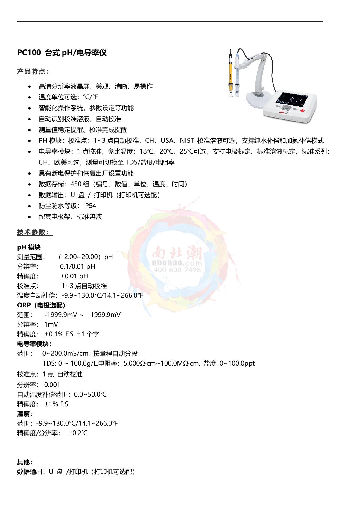 DDKSIC PC100 Benchtop pH, Conductivity Meter pH/mV (ORP electrode optional)/conductivity/resistivity/TDS/salinity/℃0.01 level(-2.000~20.000)pH0.1/0.01¥4330.0SE -