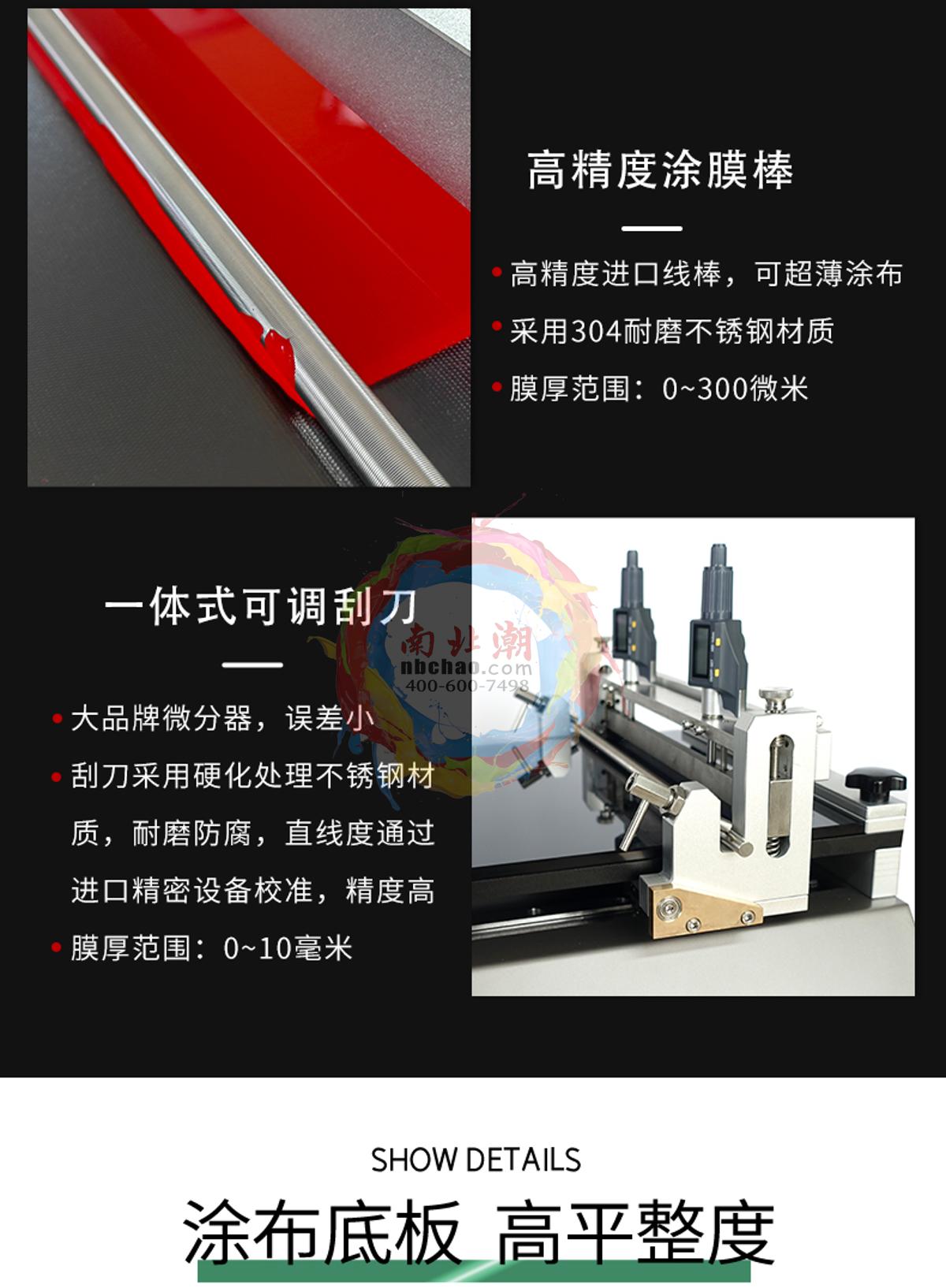 HuiNuo TM3300/04 Bar & drawdown blade heating vacuum adsorption test Film Applicator 300 * 1000mmBar + drawdown blade1~ 300Mm/s stepless speed regulation (can be customized)Vacuum adsorption + fixtureSE -