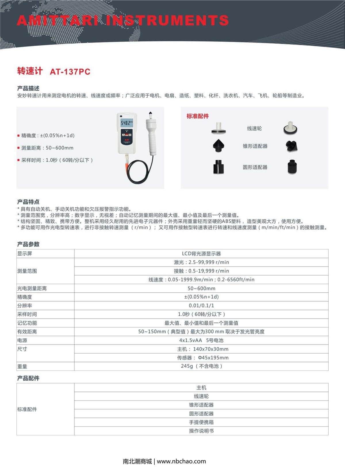 AMITTARI AT-137PC intelligent Rotation speed meter, photoelectric contact dual-use 2.5-9999 9r/minLaser: 2.5-99,999 r/min; Contact: 0.5-19,999 r/min; Line speed: 0.05-1999.9m/min; 0.2-6560ft/min50-600mm:±(0.05%n+1d)¥1550.0SE -