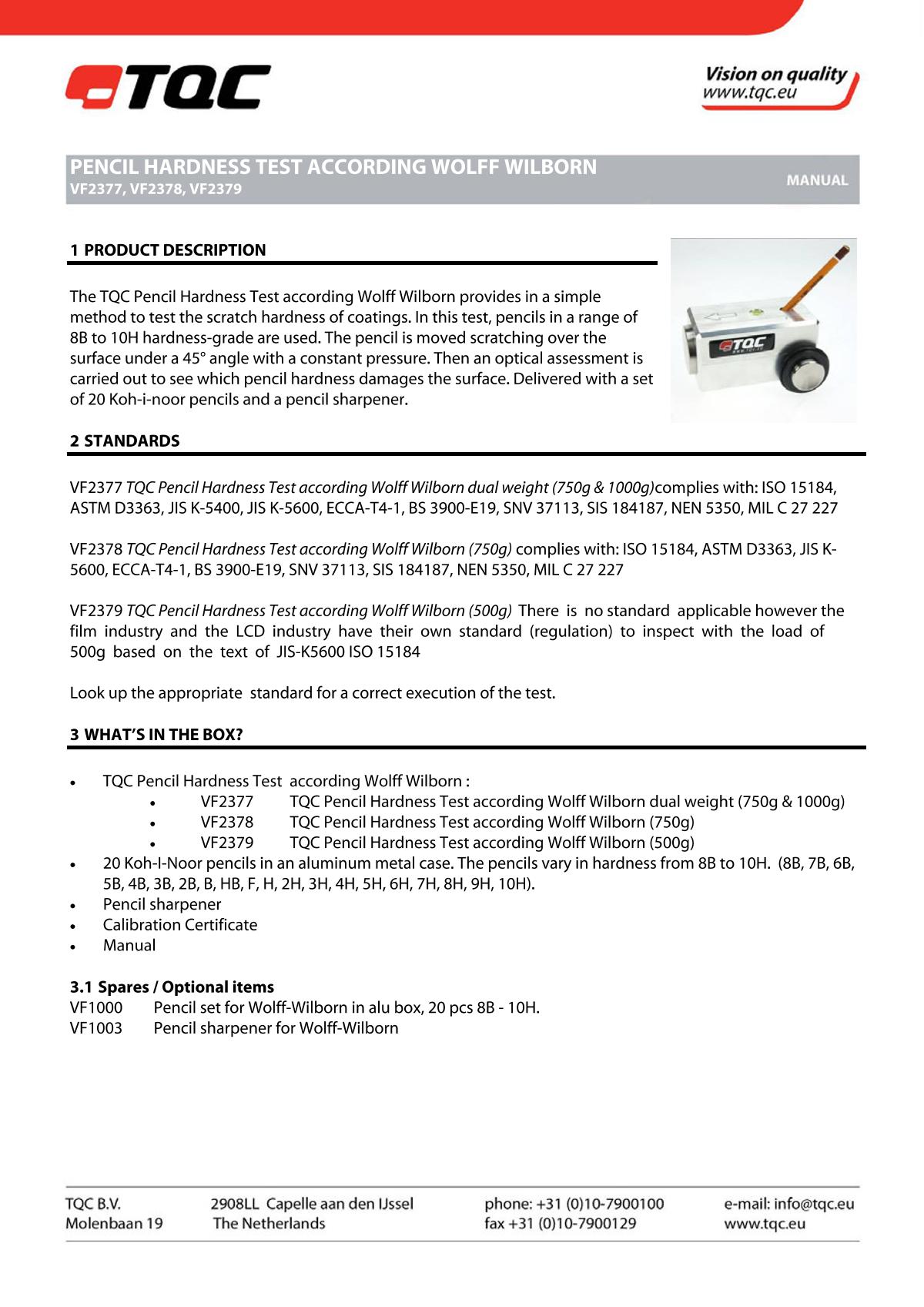 TQC sheen VF2377 Pencil Hardness Tester Manual,OI