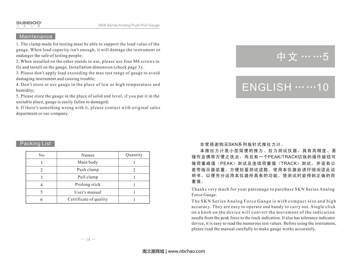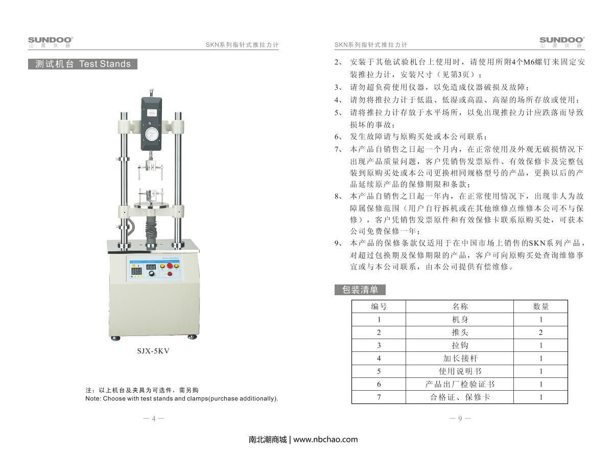 SUNDOO SKN-5 Tension and Compression Force Gauge (Pointer Type) Manual,OI