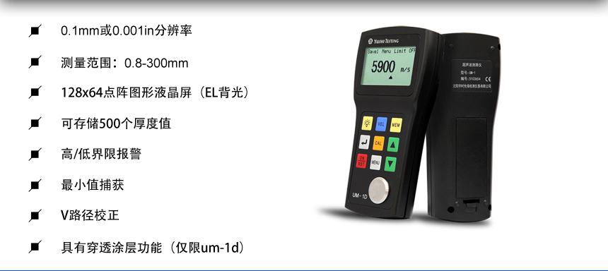 Brief Introduction: 0.1mm resolution, 128×64 dot matrix graphic LCD screen, can store 500 thickness values, high/low limit alarm, minimum value capture, two-point calibration, V path correction, mm/inch, EL backlight, Chinese/English interface.
