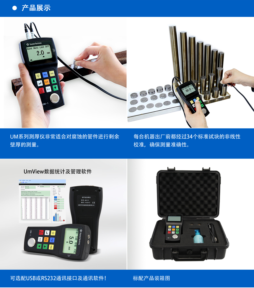| Standard Configuration: | UM-1 Thickness Gauge, standard probe, instrument case, two alkaline batteries, couplant, operating manual, certificate of conformity, packing list |