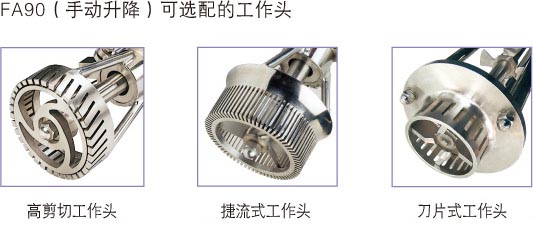 FA90 manual lifting high shear dispersion emulsifierIt is designed for pilot and simulated production and small batch production in factories, with a maximum throughput of 50L. The standard working head adopts a claw structure, and the suitable stator and rotor can be freely replaced according to different materials and process requirements. FA90 provides strong dispersion, emulsification and homogenization capabilities. The whole machine has the functions of frequency conversion speed regulation, speed display, electric lifting or manual hydraulic lifting. It can complete a variety of processes such as stirring, dispersion, homogenization, emulsification, strong mixing, solid-liquid dispersion and mixing.