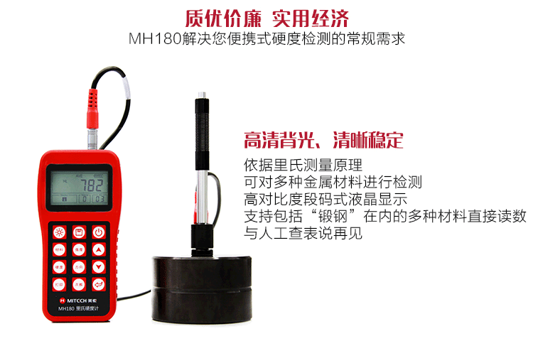 MH180 portable Leeb Hardness Tester is based on the Leeb hardness measurement principle, which can easily and quickly test the hardness of a variety of metal materials on site, and supports free conversion between Leeb, Brinell, Rockwell and other hardness systems. It adopts high-contrast segment code LCD display, which is small in size, light in weight, easy to carry, and stable and reliable in performance. It is widely used in metal processing and manufacturing, special equipment, failure analysis of long-lasting components, commodity inspection and other fields. It can meet the conventional needs of industrial hardness testing, with high quality and low price, and is the preferred choice for practical and economical Hardness Testers.