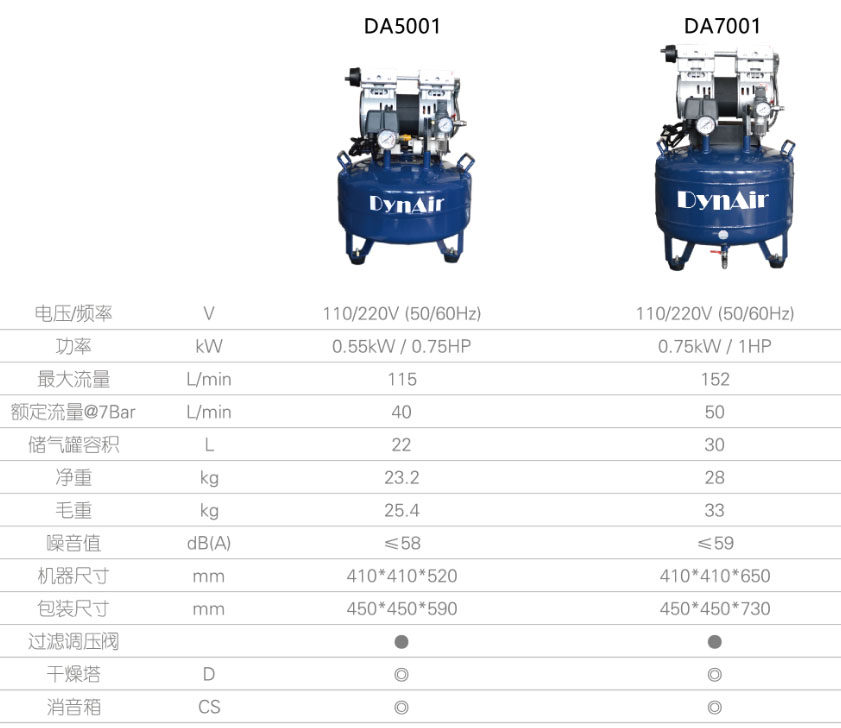 Dasheng DA5001 silent oil-free Air Compressor is suitable for oral cavity, endoscope, cleaning tank medical support, pharmaceutical, food fermentation, life science, biotechnology, analytical instruments, measuring instruments, water treatment, laboratory, environmental monitoring, automation, coating surface treatment, beauty, clothing manufacturing, footwear, petrochemical, stage background, automobile braking and other industries.