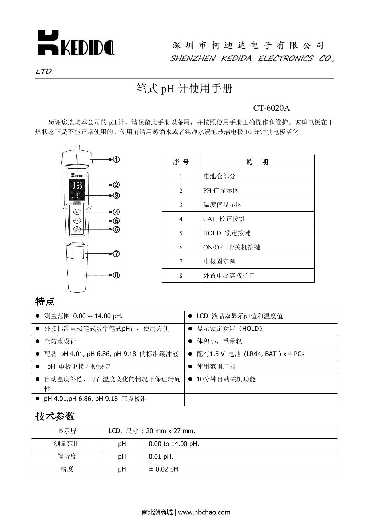 KEDIDA CT-6023 Pen type acidity meter with built-in electrode PH Range: 0.00~14.00PHPH value0~14pH±0.02pH¥280.0SE -