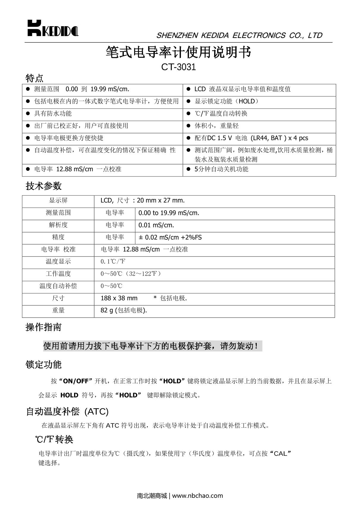 KeDiDa CT-6322 pH & Conductivity Detector Pen Range: 0.0~14.0PH/0.0~199.9USpH:0.0 to 14.0pH;电导: 0.0 to 1999 uS/cmpH: ± 0.1 pH<--sep--0/>: ± 0.1 uS / cmpH: ± 0.1 pH; Conductivity Detector: ± 2% FS¥380.0SE -
