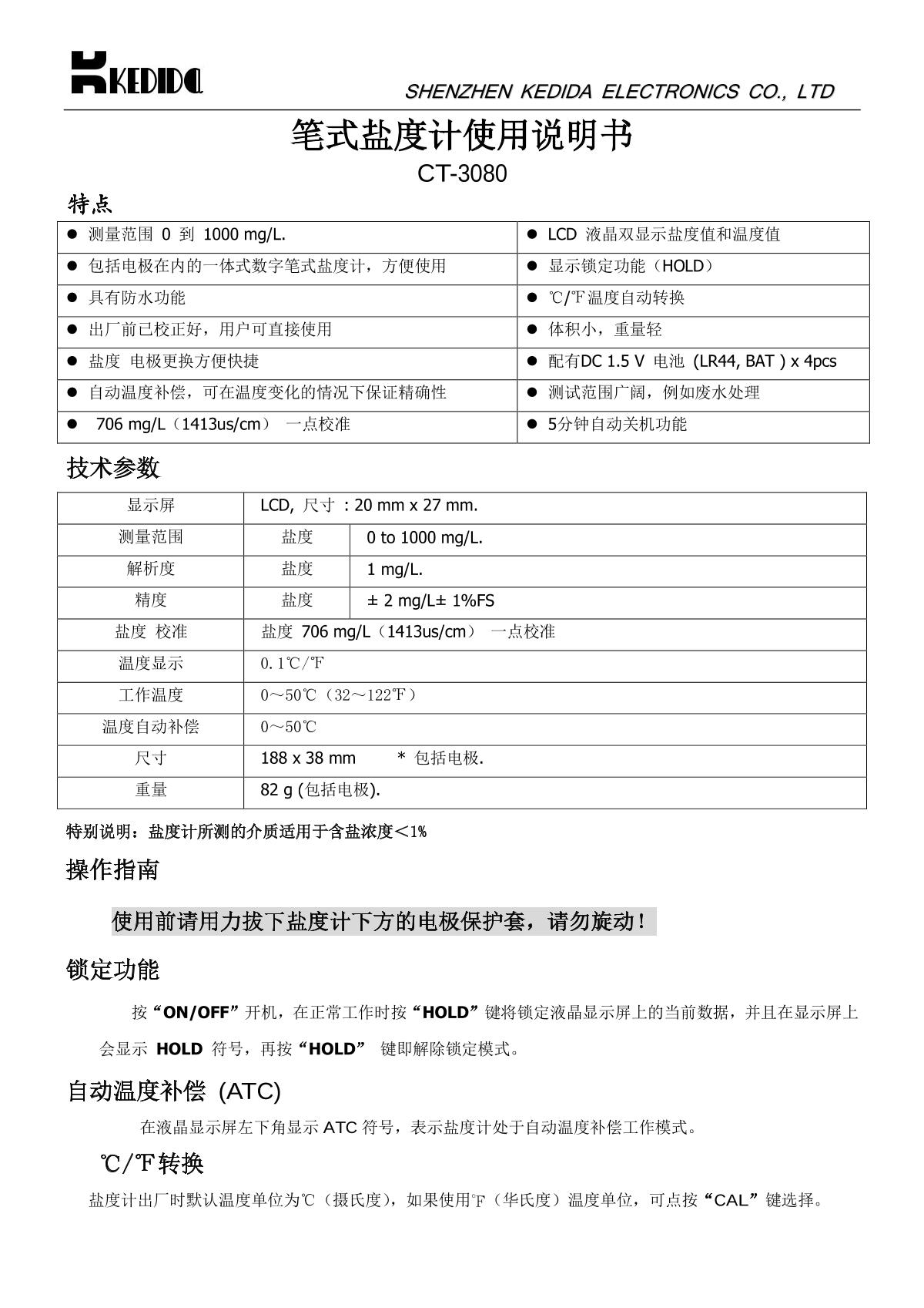KeDiDa CT-3086 Pen Salinometer Inductive built-in electrode Range: 0.0~5.0%LCD20 mm x 27 mm0.0%~5.0%¥360.0SE