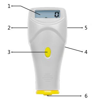 1. Display; 2. USB cable interface; 3. Power/zero key; 4. Battery cover; 5. Wrist strap buckle; 6. Measuring sensor
