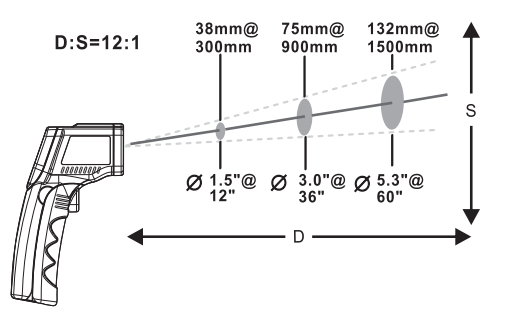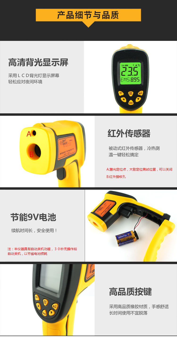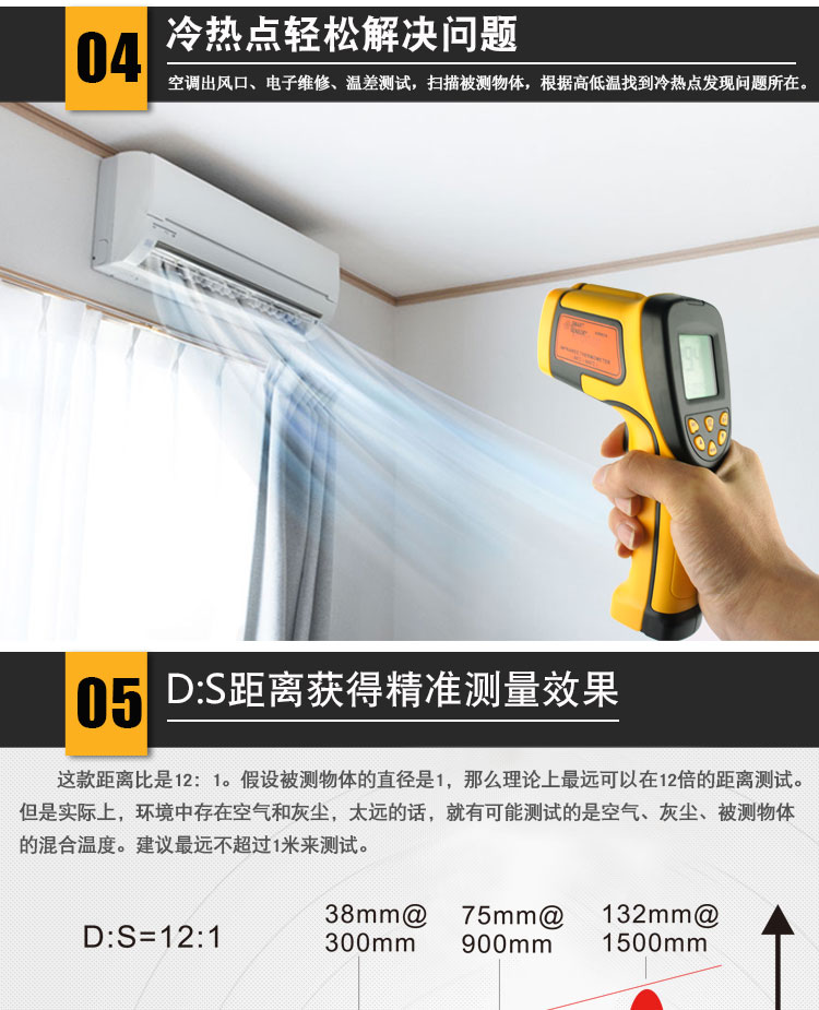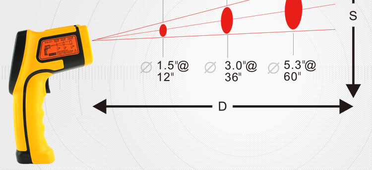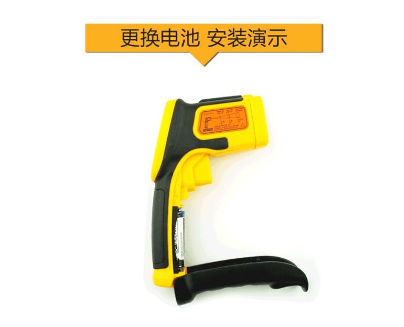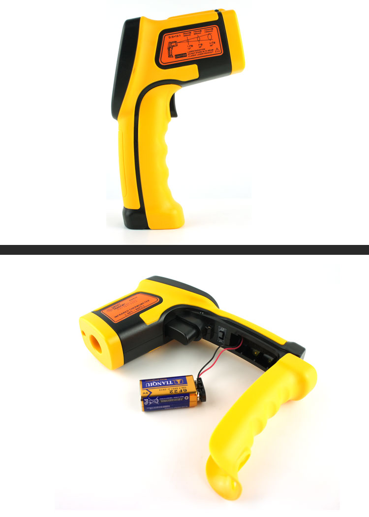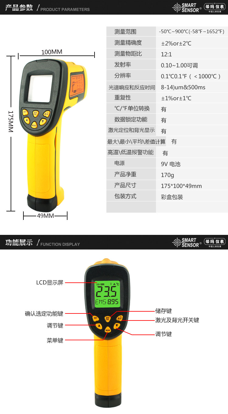 -50~900 ℃, Accuracy +/- 2%, resolution 0.1 ℃, sexual repeability +/- 1 ℃| +/- 1%, object distance ratio 12:1, emissivity 0.10~1.00, response time 500ms, 9V battery