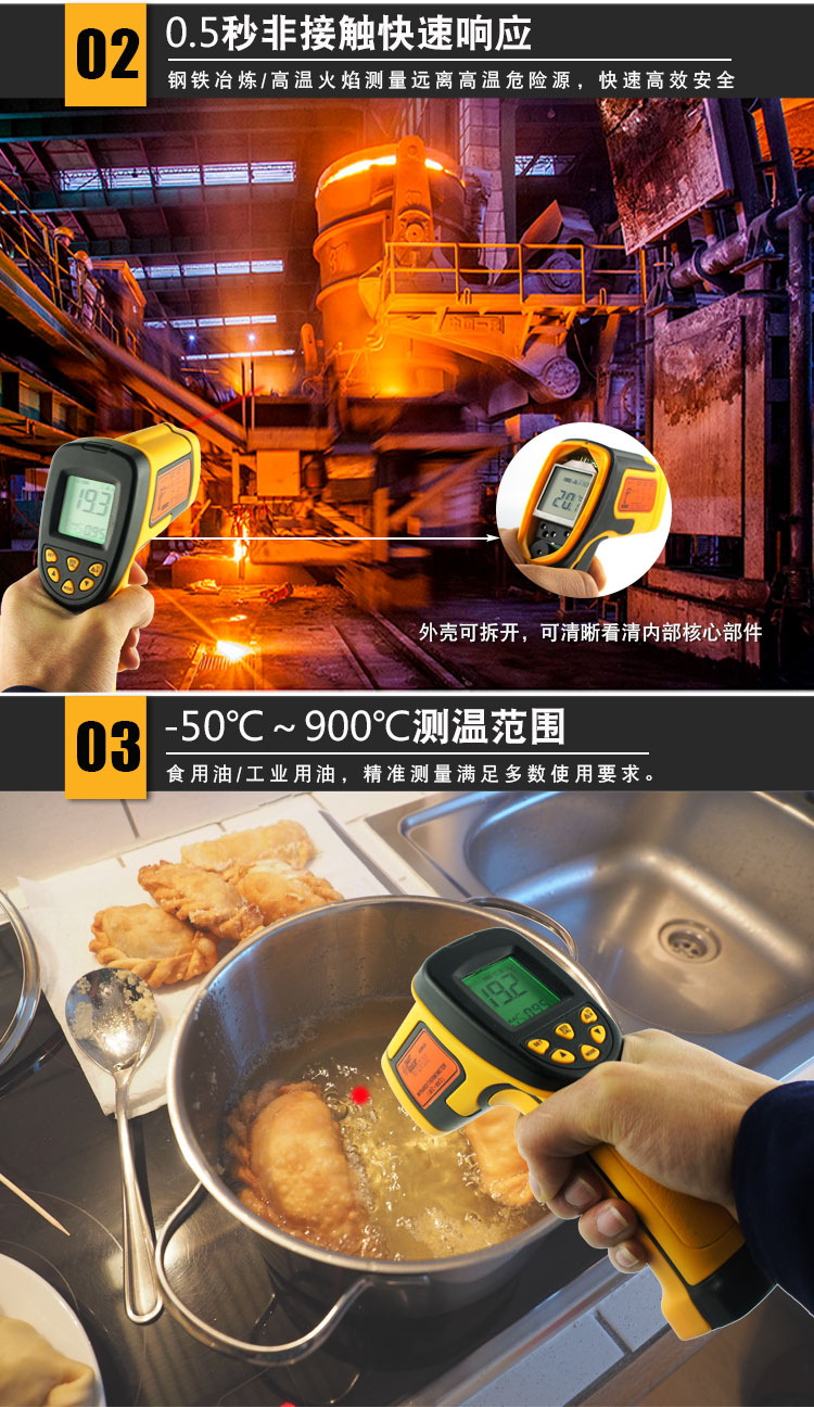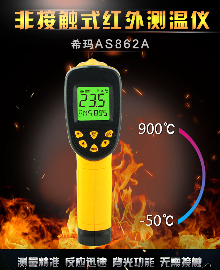 The product is compact, tamper-proof and easy to use. Just aim and press a button, and the current surface temperature of the object under test can be read within one second. For hot, toxic or hard-to-reach objects, use this product to measure safely.