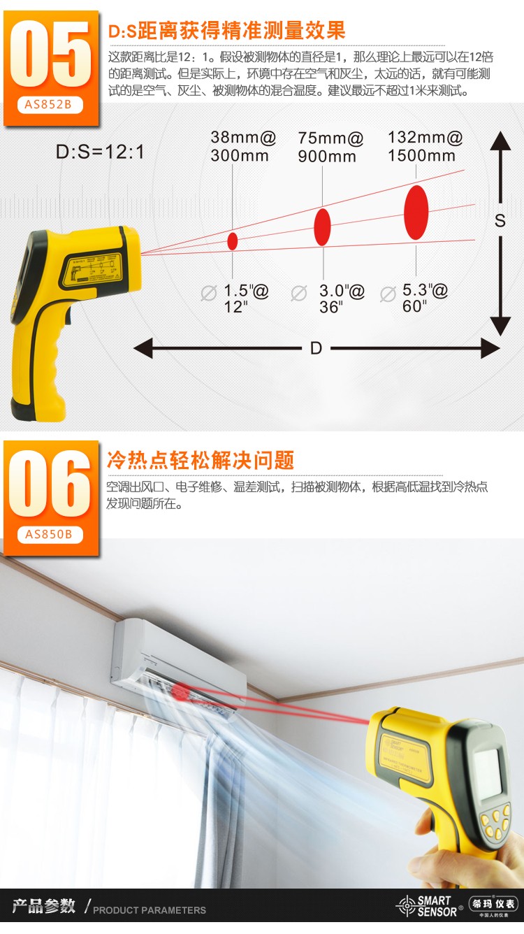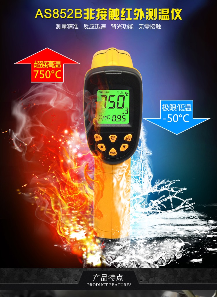 Industrial grade temperature measuring guns AS852B and AS862A are both available.
