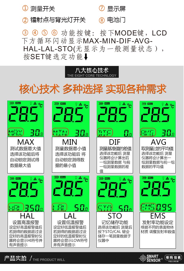 The medium and low temperature model can detect the surface temperature of distant objects without contact through infrared induction and optical principles. Compared with traditional contact thermometers, it has fast temperature measurement response, high precision, no contact, no consumables, etc. Advantages, widely used in chemical industry, environmental testing, heating and refrigeration, non-destructive testing and other industries. Blister or plastic box packaging.