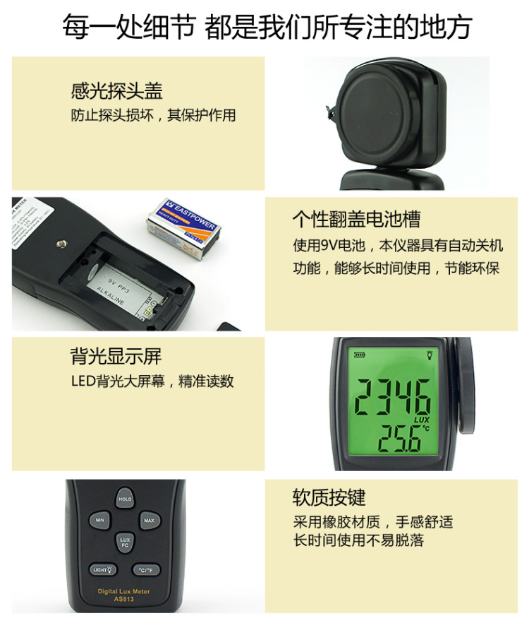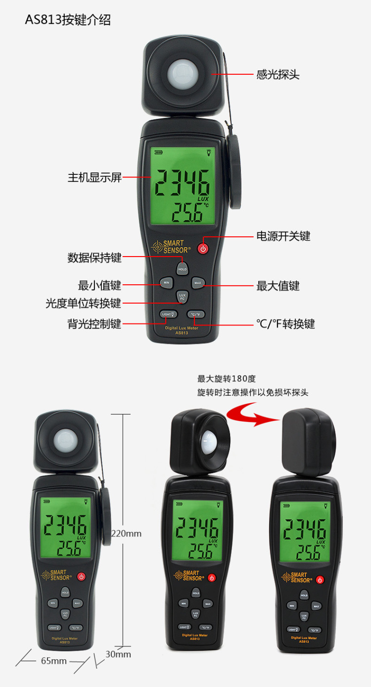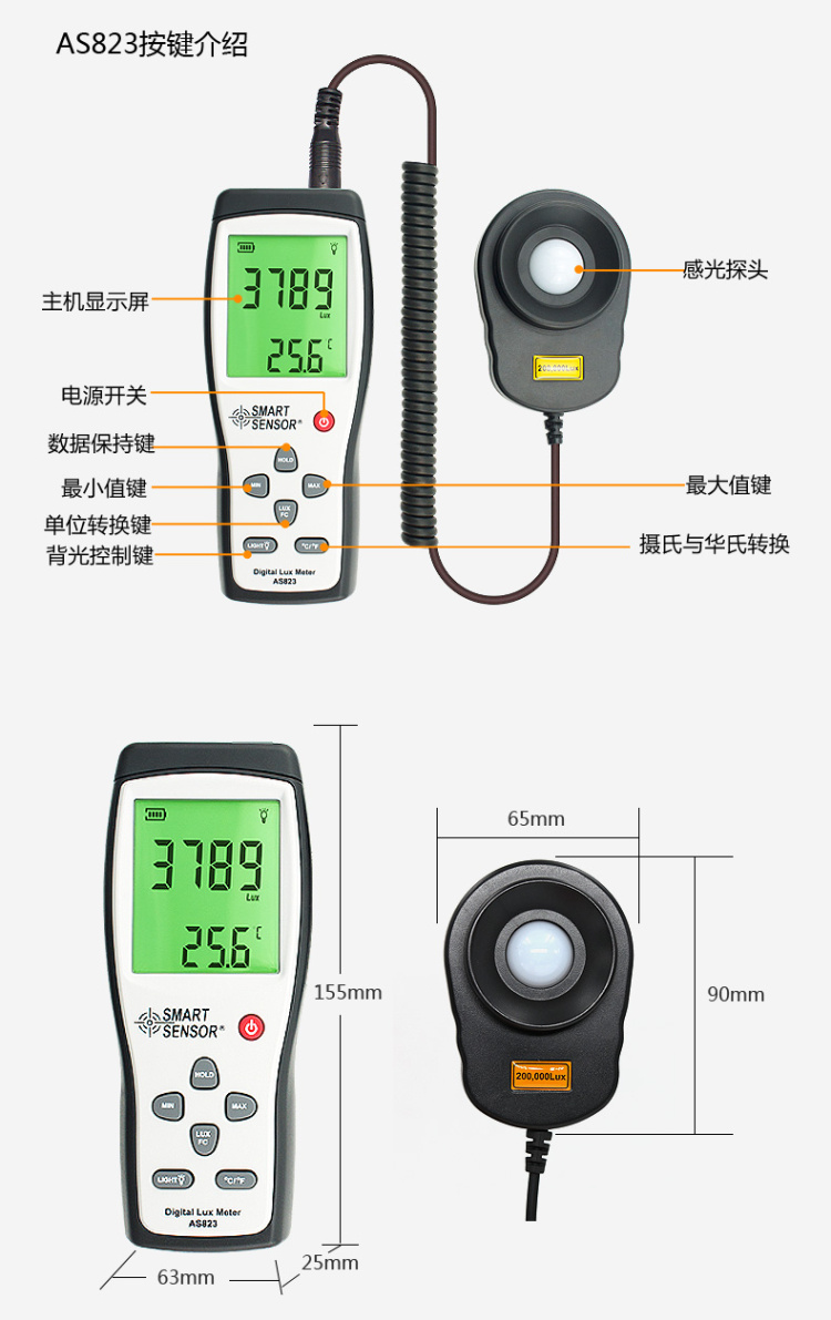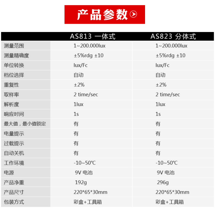 Measurement range 1~ 200.000Lux, gear selection automatic, measurement unit Lux/Fc, illuminance accuracy +/- 5% rdg +/- 10, resolution 1Lux, repeability +/- 2%, sampling rate 2 times/second, response time 1s
