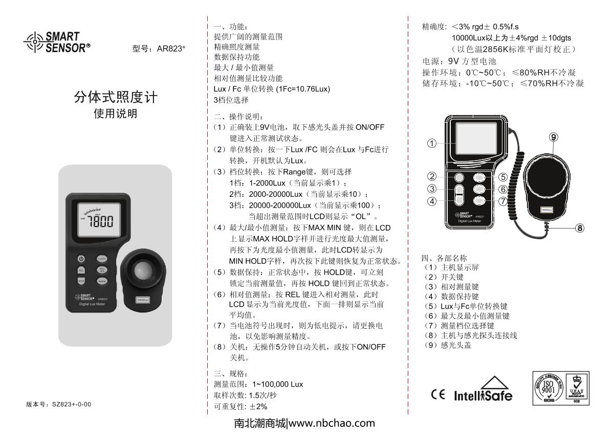 SMART SENSOR AR823+ Split Illumrination degree meter Manual,OI