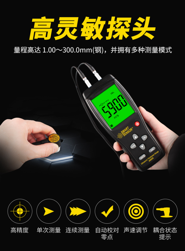 Metals, plastics, ceramics, glass and any other good conductors of ultrasonic waves can use this instrument to measure thickness as long as there are two parallel surfaces, such as aluminum, copper, gold, resin, water, glycerin, etc. Cast iron is not suitable for using this instrument because of its internal crystal grains are too coarse!