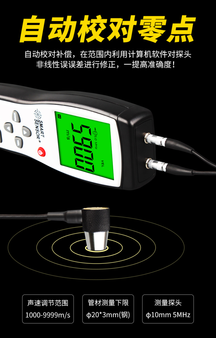 Sound velocity measurement and storage sound velocity function: directly measure the sound velocity according to the thickness of the sample, avoiding the trouble of table lookup or conversion; 12 sound velocity values can be stored;