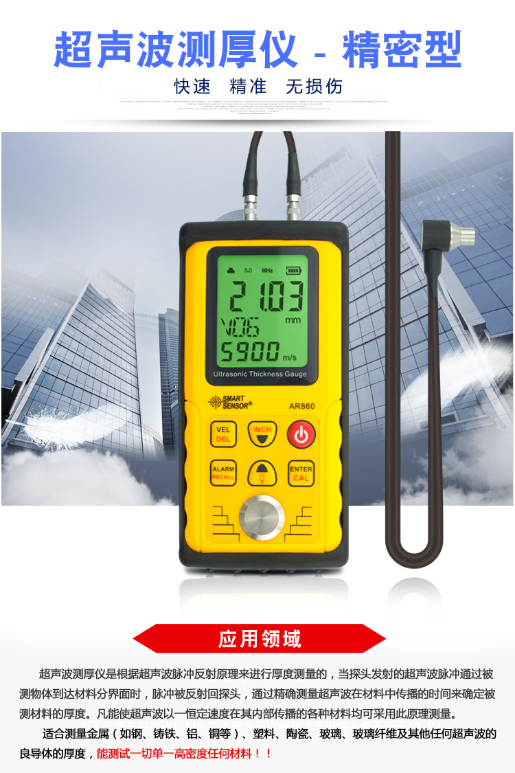 SIMA AR860 Ultrasonic Thickness Gauge adopts the principle of ultrasonic measurement and is suitable for measuring the thickness of various Accurate measurement of various processing parts, another important aspect is that it can monitor , and monitor their thinning degree after being corroded during use. It can be widely used in petroleum, Chemical industry, metallurgy, shipbuilding, aviation, aerospace and other fields.
