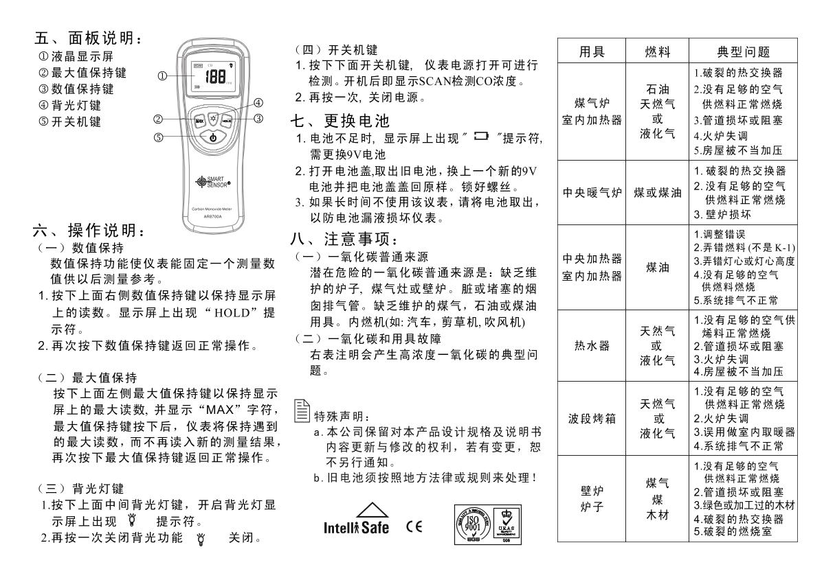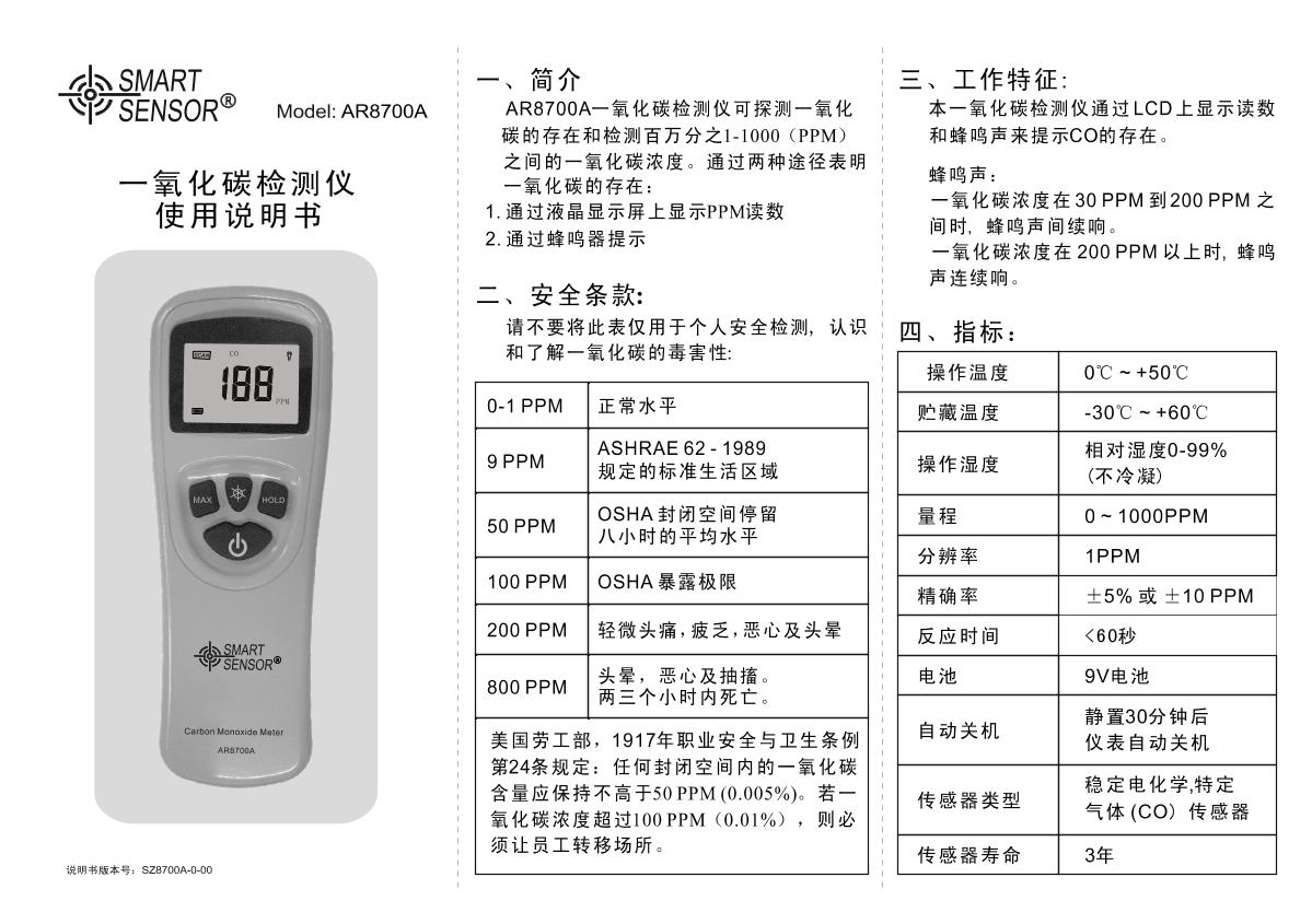 SMART SENSOR AR8700A Carbon monoxide compositIon Meter Manual,OI