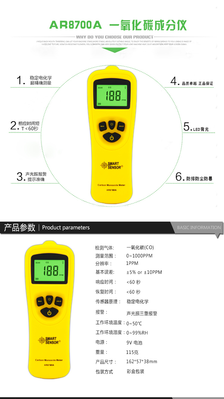 SMART SENSOR AS8700A Portable carbon monoxide alarmPacking list