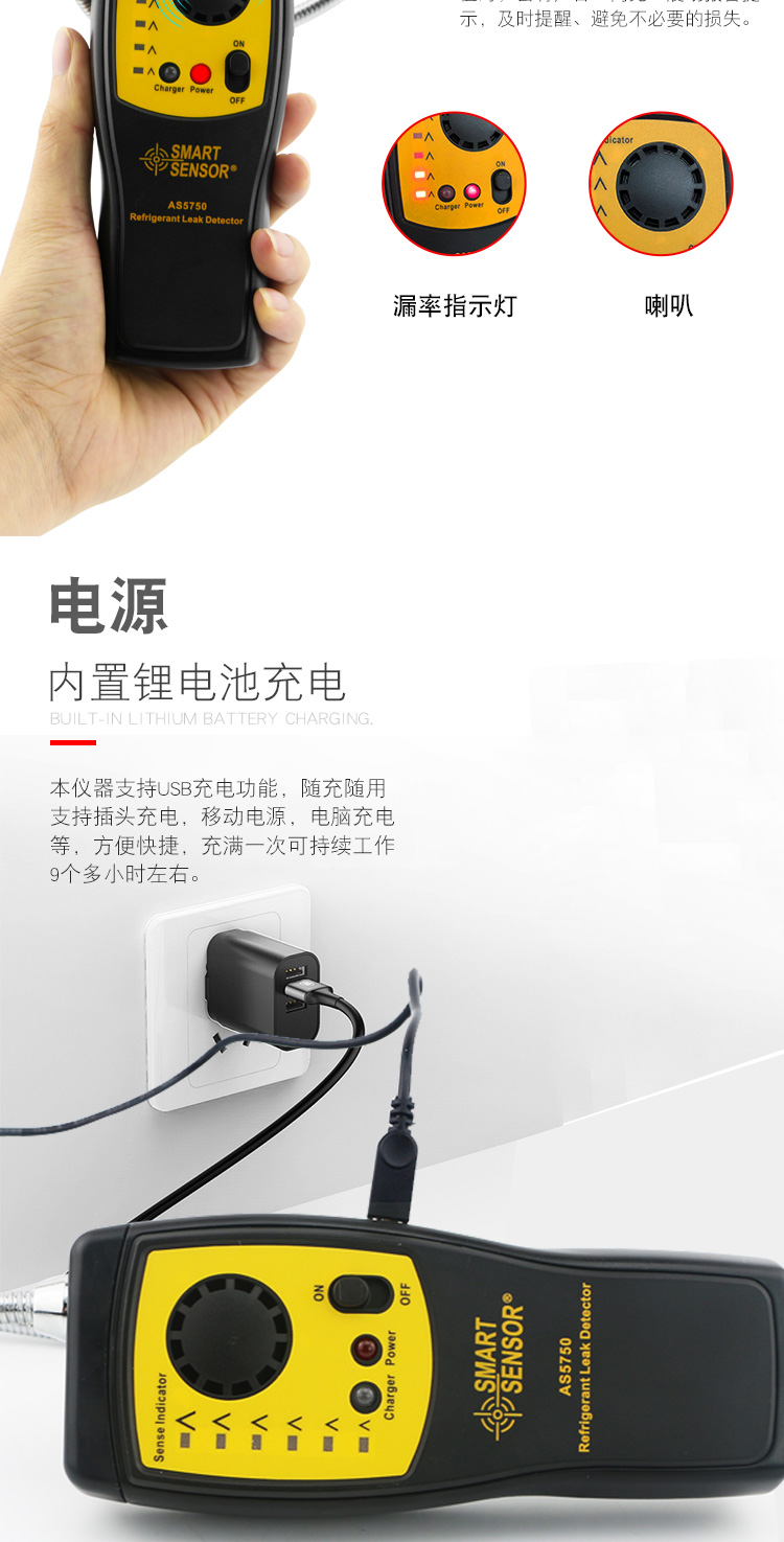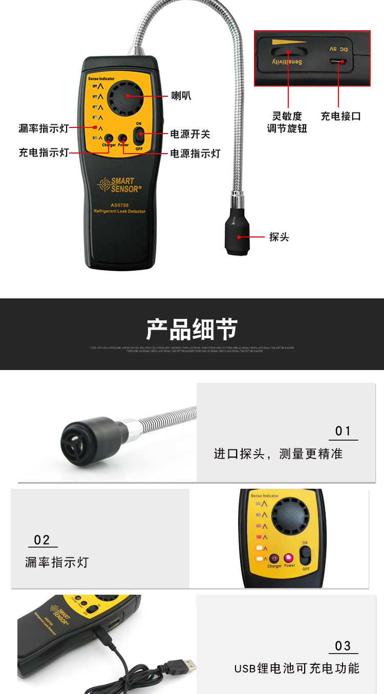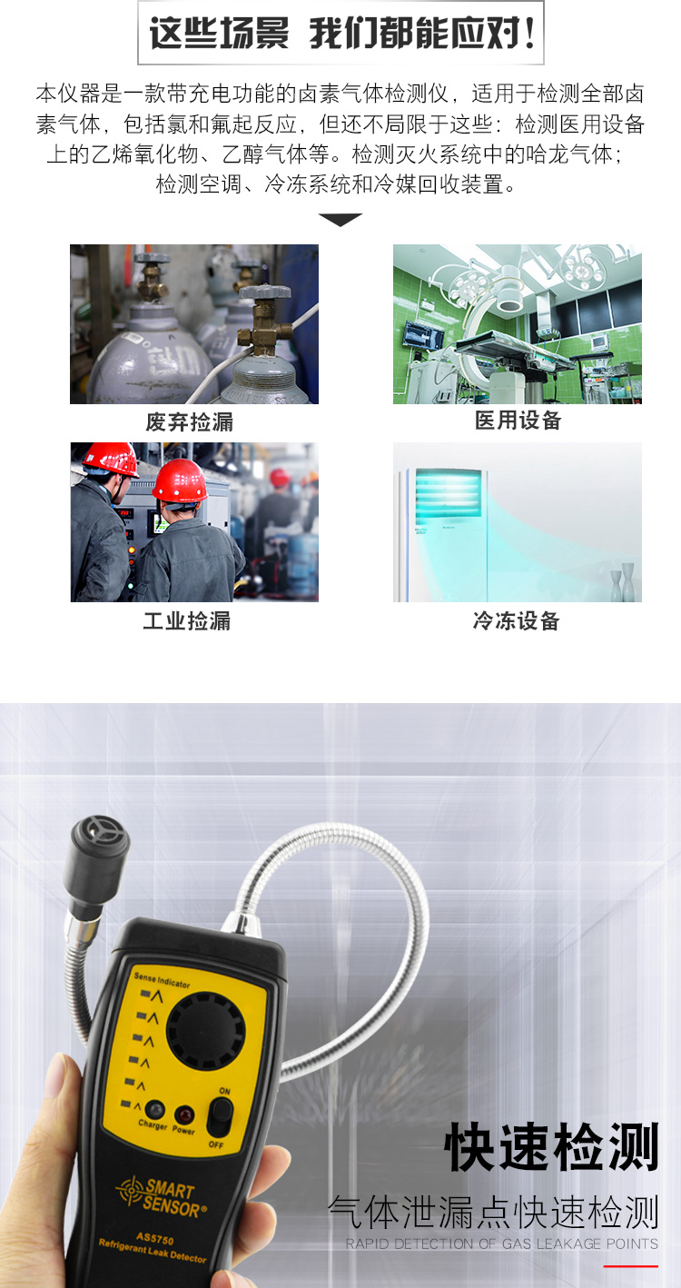 Using semiconductor Sensors principle, it can accurately detect flammable gases, refrigerants and halogen gases, etc., with high sensitivity and can detect gas leaks as low as 0.5 ounces/year. The response time is only 1 second, and the warm-up period is less than 110 seconds