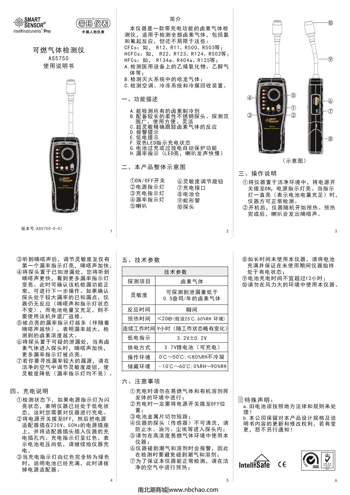SMART SENSOR AS5750 Gas Detector halogen Manual,OI